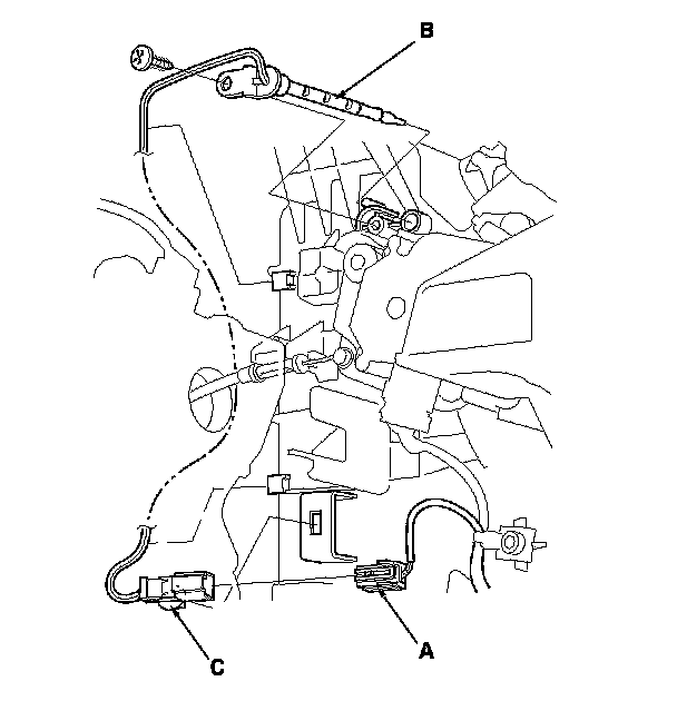 3. Disconnect the connector (A) from the front evaporator temperature sensor (B), then remove the connector clip (C). Remove the self-tapping screw and the front evaporator temperature sensor.