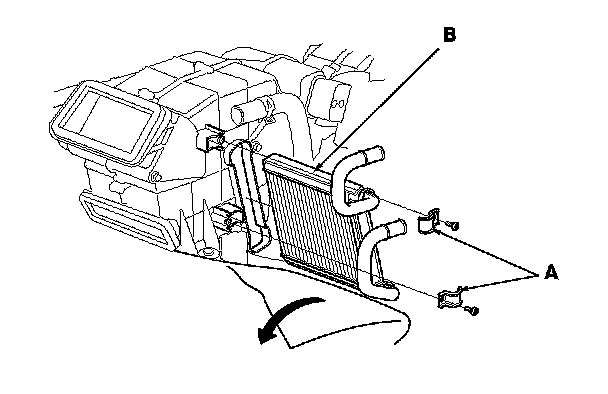 4. Turn over the carpet. Remove the self-tapping screws and the clamps (A). Carefully pull out the rear heater core (B) without bending lines.