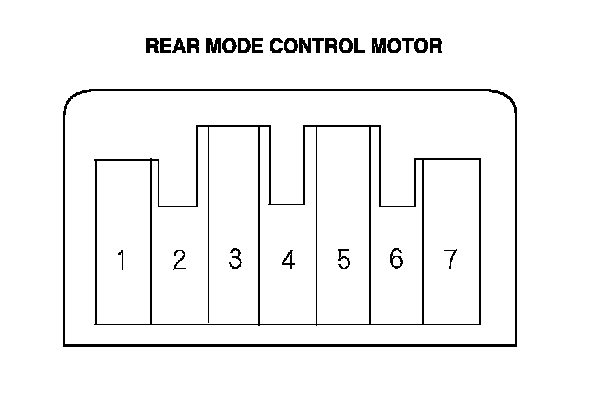 2. Connect battery power to the terminal No. 1 of the rear mode control motor, and ground the terminals No. 5 and No. 7; the rear mode control motor should run smoothly. To avoid damaging the rear mode control motor, do not reverse power and ground. Disconnect the terminals No. 5 or No. 7 from ground; the rear mode control motor should stop at Vent (when the terminal No. 5 is disconnected) or Heat (when the terminal No. 7 is disconnected). Don't cycle the rear mode control motor for a long time.