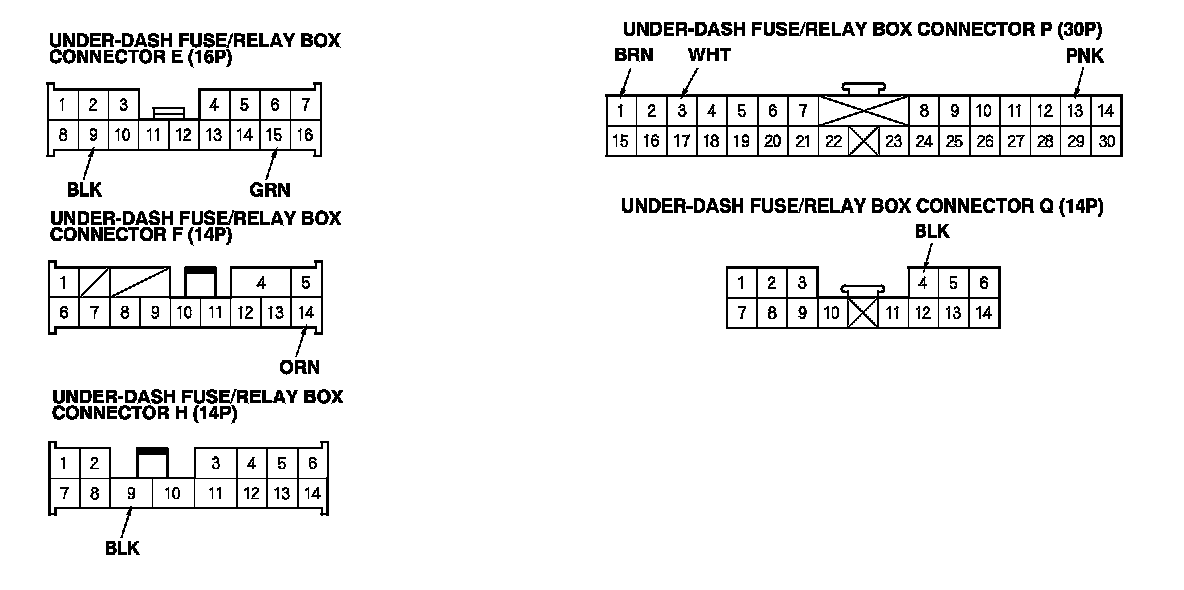 8. Reconnect the under-dash fuse/relay box connectors, turn the ignition switch to ON (II), and do these input tests at the following connectors.