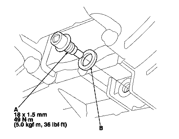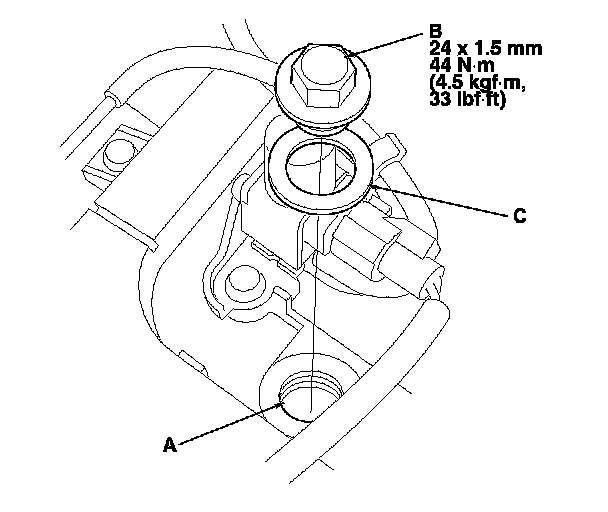 8. Install the ATF filler bolt (B) and a new sealing washer (C).