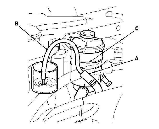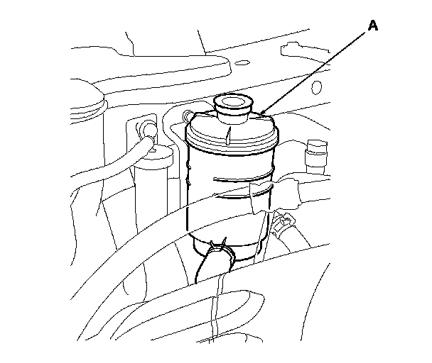 Check the reservoir (A) at regular intervals, and add the recommended fluid as necessary. Always use Acura Power Steering Fluid. Using any other type of power steering fluid or automatic transmission fluid can cause increased wear and poor steering in cold weather.