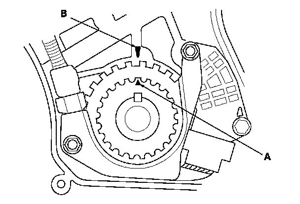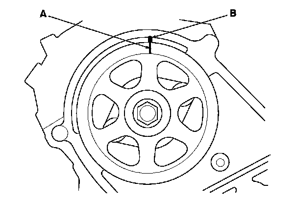 2. Set the timing belt drive pulley to top dead center (TDC) by aligning the TDC mark (A) on the tooth of the timing belt drive pulley with the pointer (B) on the oil pump.