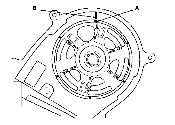 15. Turn the crankshaft pulley so the white mark (A) lines up with the pointer (B).