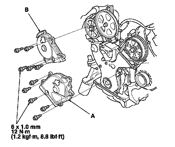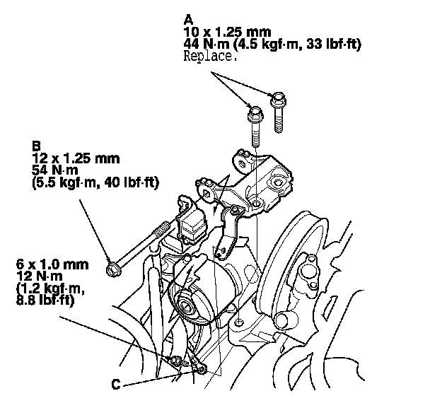 17. Install the upper half of the side engine mount bracket, and tighten the new mounting bolts (A), then tighten the mass damper mounting bolt (B).
