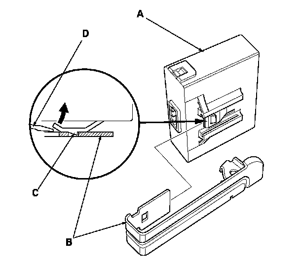 NOTE: While separating the TPMS control unit from the bracket, release the hook (C) on the TPMS control unit using a flat-tipped screwdriver (D), and push it up to remove the bracket.