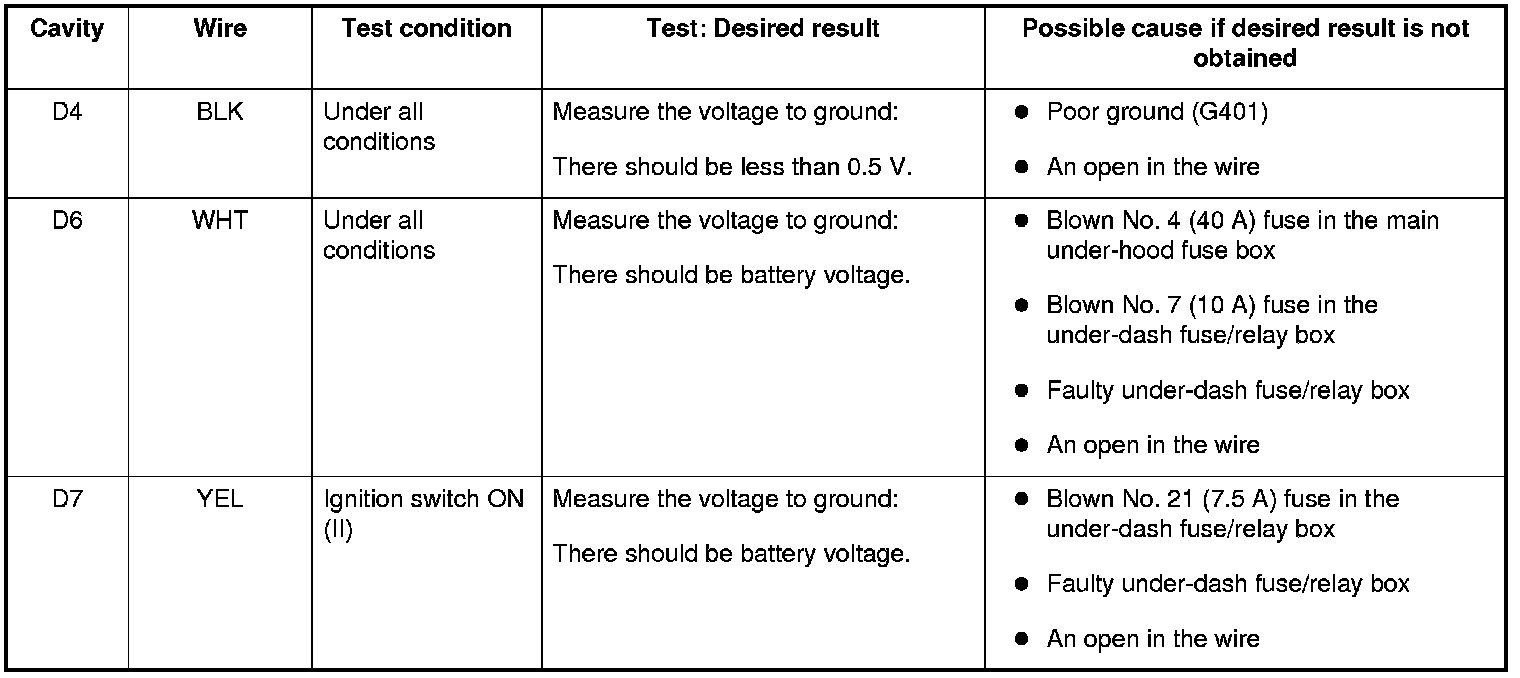 NOTE: Before testing the relay control module, troubleshoot the multiplex integrated control unit first, using B-CAN System Diagnosis Test Mode A. Troubleshooting - B-CAN System Diagnosis Test Mode A