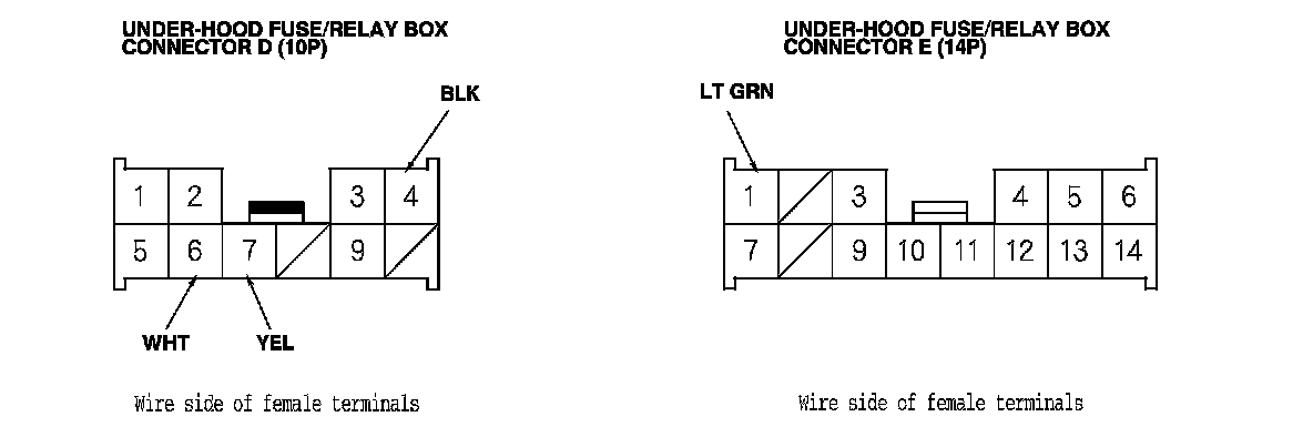 3. Disconnect under-hood fuse/relay box connectors D (10P) and E (14P).