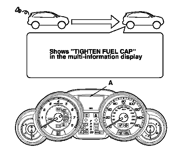 The first time a leak is detected a "TIGHTEN FUEL CAP" message appears in the multi-information display (A). To scroll to another message, press the select/reset button. The "TIGHTEN FUEL CAP" message will appear each time you restart the engine until the system turns the message off. Turn the engine off then replace or tighten the fuel fill cap until it clicks at least once.