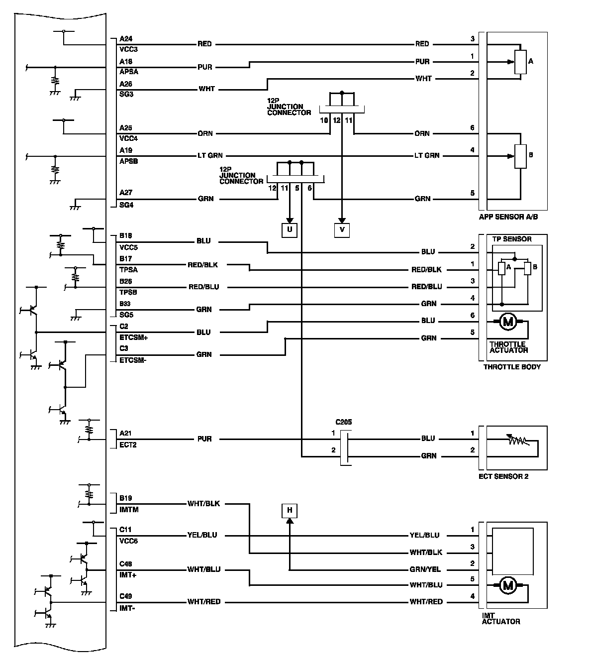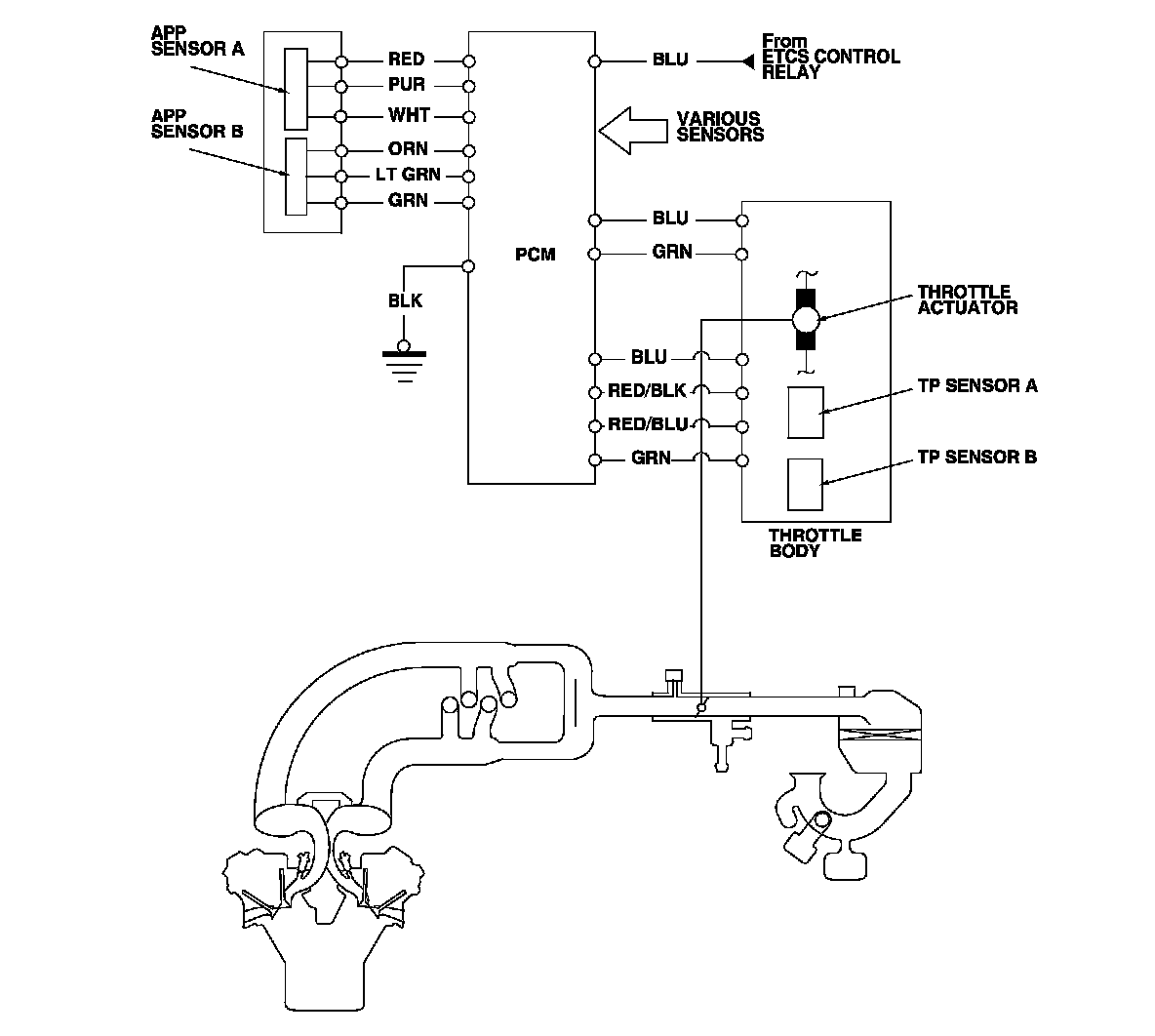 The electronic throttle control system consists of the throttle actuator, throttle position (TP) sensor A/B, accelerator pedal position (APP) sensor A/B, the electronic throttle control system (ETCS) control relay, and the PCM.