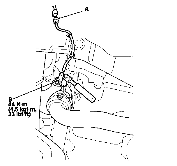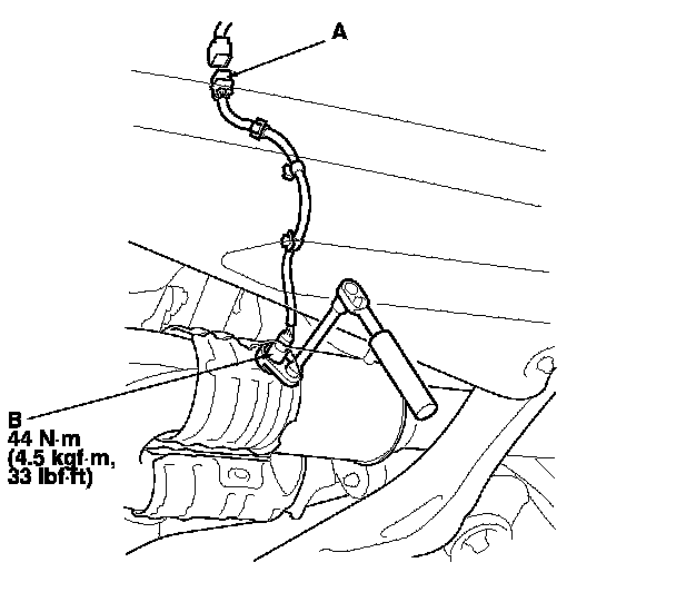 1. Disconnect the front secondary HO2S 4P connector (A), then remove the front secondary HO2S (B).