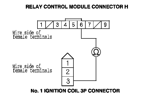 4. Check for continuity between the relay control module connector H terminal No. 6 and No. 1 ignition coil 3P connector terminal No. 3.