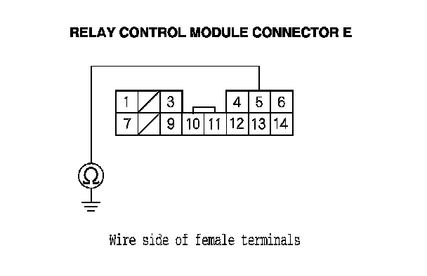 5. Check for continuity between the relay control module connector E terminal No. 5 and body ground.