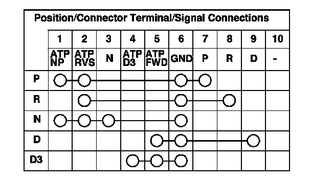 7. Check for continuity between terminals at the transmission range switch connector. There should be continuity between the terminals in the following table for each transmission range switch position.