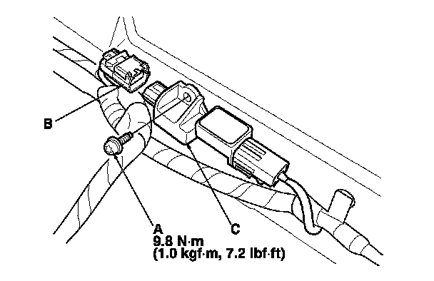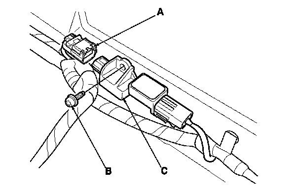 1. Install the new roll rate sensor with the TORX bolts (A) then connect the floor wire harness 2P connector (B) to the roll rate sensor (C).