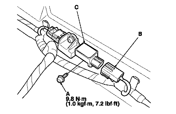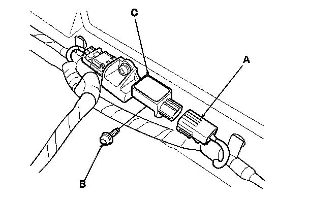 1. Install the new rear safing sensor with the TORX bolt (A) then connect the floor wire harness 4P connector (B) to the rear safing sensor (C).