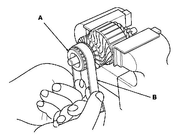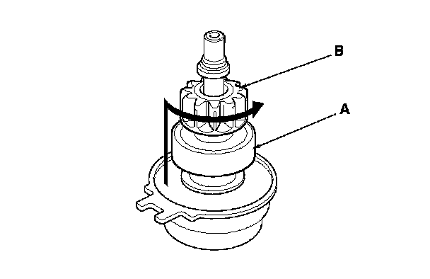 19. Hold the drive gear (B), and turn the overrunning clutch in the direction shown to make sure it turns freely. Also make sure the overrunning clutch locks in the opposite direction. If it does not lock, replace the overrunning clutch assembly.
