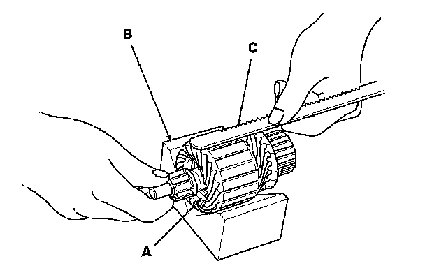 12. Place the armature (A) on an armature tester (B). Hold a hacksaw blade (C) on the armature core. If the blade is attracted to the core or vibrates while the core is turned, the armature is shorted. Replace the armature.