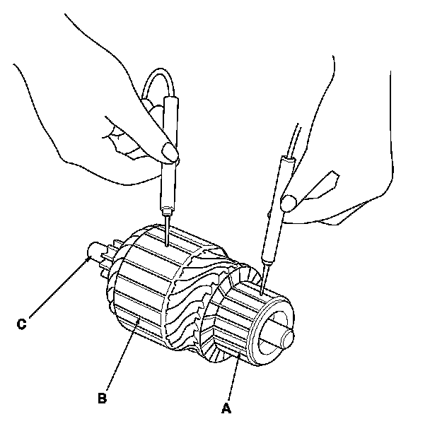 13. Use an ohmmeter to check for continuity between the commutator (A) and the armature coil core (B), and between the commutator and the armature shaft (C). If there is continuity, replace the armature.