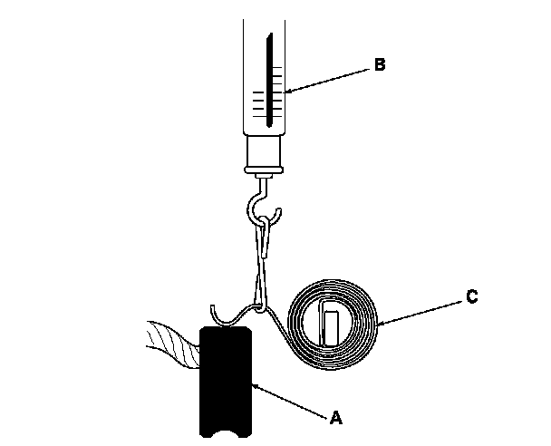 16. Insert the brush (A) into the brush holder, and bring the brush into contact with the commutator, then attach a spring scale (B) to the spring (C). Measure the spring tension at the moment the spring lifts off the brush. If it is not within the standard, replace the brush holder assembly.