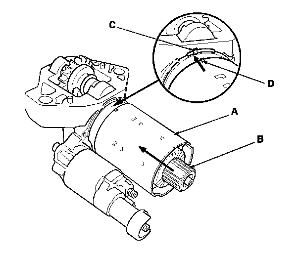 24. Install the armature housing (A) and armature (B) by aligning the slotted point (C) to the projection (D).