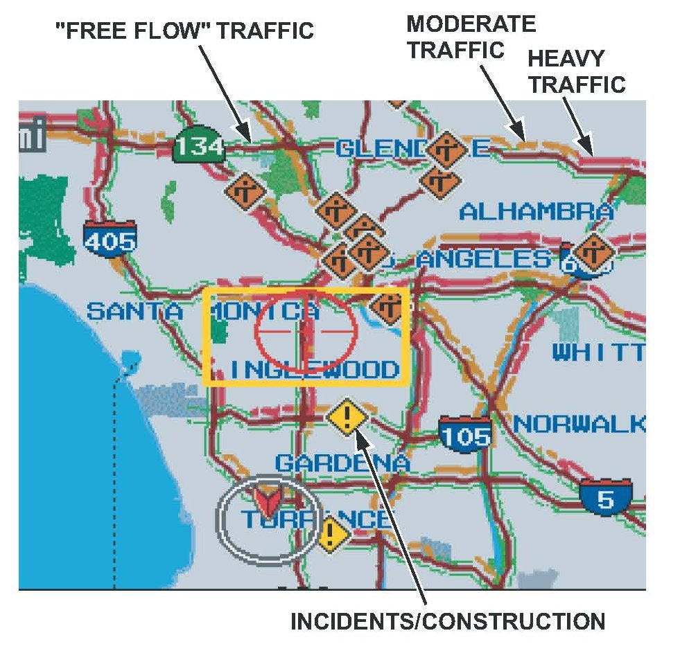 Current traffic information can be displayed by the system in many metropolitan areas. Information is displayed as traffic flow bands of different colors on selected roads, or as diamond-shaped icons.