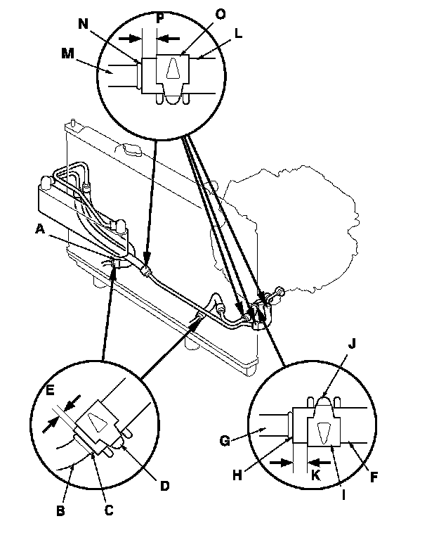 3. Slide the ATF cooler hoses (L) over the ATF cooler lines (M) until the hose ends contact with the bulge (N) of the ATF cooler line, and secure the hoses with the clips (O) at 6-8 mm (0.2-0.3 in.) (P) from the hose end.