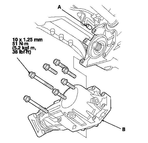2. Install the dowel pin (A) in the transmission, and install the transfer assembly (B) on the transmission.