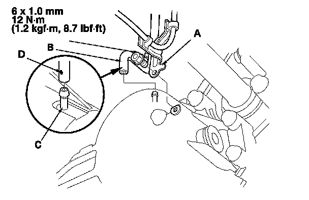 4. Secure the transfer breather hose bracket (A) on the transfer assembly with the bolt, and install the breather hose (B) over the breather pipe (C) with the dot (D) facing out.