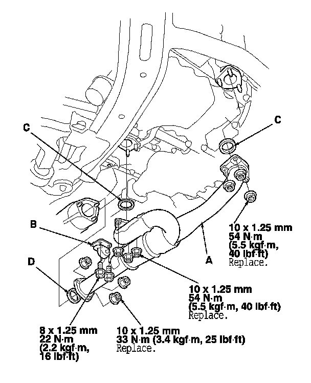 5. Install exhaust pipe A with the new self-locking nuts, its mount (B), and new gaskets (C), (D).