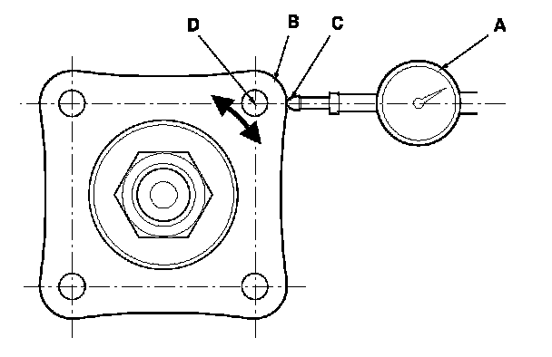 5. Set a dial indicator (A) on the transfer companion flange (B); position dial indicator tip (C) on the direct extension of the bolt hole center (D).