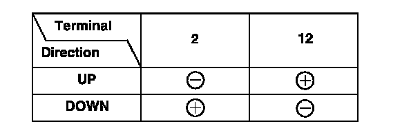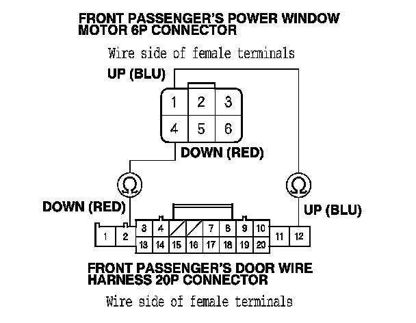 2. At the front passenger's door wire harness 20P connector, test the power window motor in each direction by connecting battery power and ground according to the table. When the motor stops running, disconnect one lead immediately.