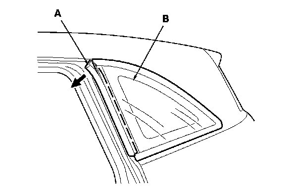 3. Remove the front seal (A) from the front edge of the quarter glass (B). If necessary, cut the front seal with a utility knife.