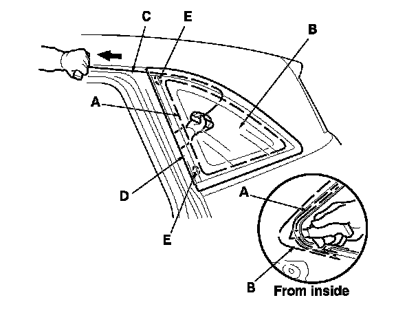 - If the quarter glass will be reinstalled, take care not to damage the molding (D).