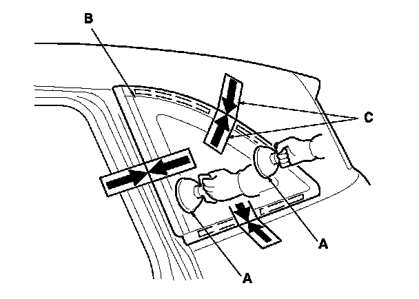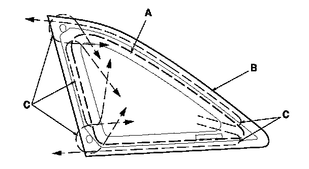 4. Carefully cut through the adhesive (A) at the rear corner portion of the quarter glass (B) with a utility knife. With a helper on the outside, pull the piano wire (C) back and forth in a sawing motion. Hold the piano wire as close to the quarter glass as possible to prevent damage to the body, and carefully cut through the adhesive around the entire quarter glass:
