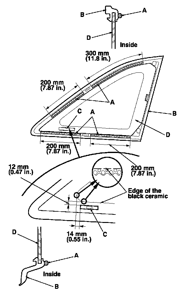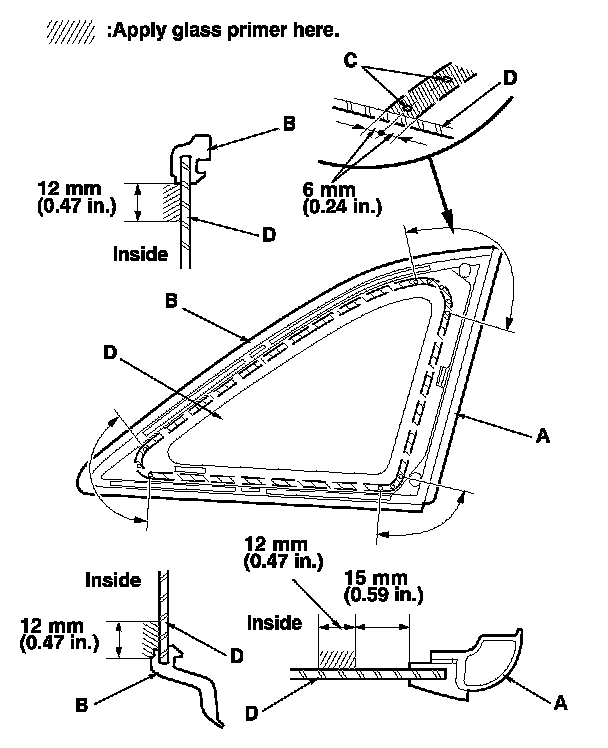 - With the printed dots (C) on the quarter glass (D) as a guide, apply the glass primer to the front portion of the quarter glass.