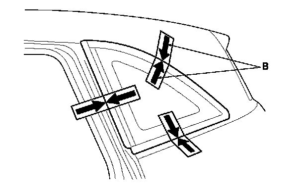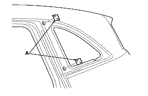 11. If the old quarter glass will be reinstalled (and either clip is broken off the molding), seal the body holes with pieces of urethane tapes (A). Then set the quarter glass upright in the opening, and make alignment marks (B) across the quarter glass and body with a grease pencil at the three points shown. Be careful not to touch the quarter glass where adhesive will be applied.