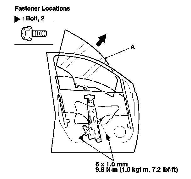 4. Carefully lower the glass (A) until you can see the bolts, then remove them. Carefully pull the glass out through the window slot. Take care not to drop the glass inside the door.