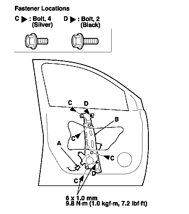 6. Remove the bolts (C), and loosen the bolts (D), then remove the regulator through the hole in the door.