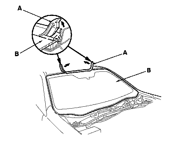 2. Remove the molding (A) from the upper edge of the windshield (B). If necessary, cut the molding with a utility knife.