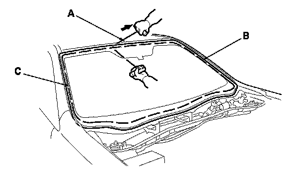 Carefully cut through the rubber dam and adhesive (C) around the entire windshield.