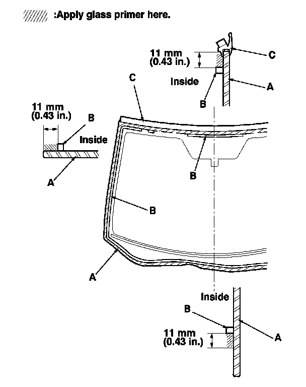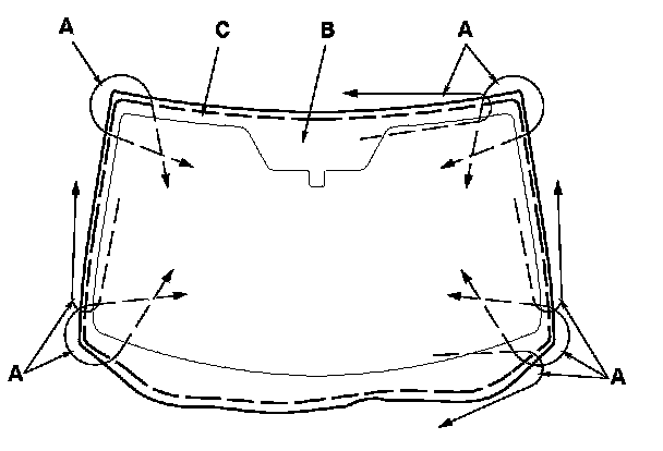 17. With a sponge, apply a light coat of glass primer around the edge of the windshield (A) between the dams (B) and molding (C) as shown, then lightly wipe it off with gauze or cheesecloth: