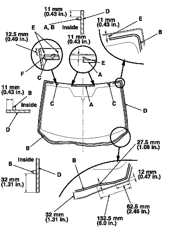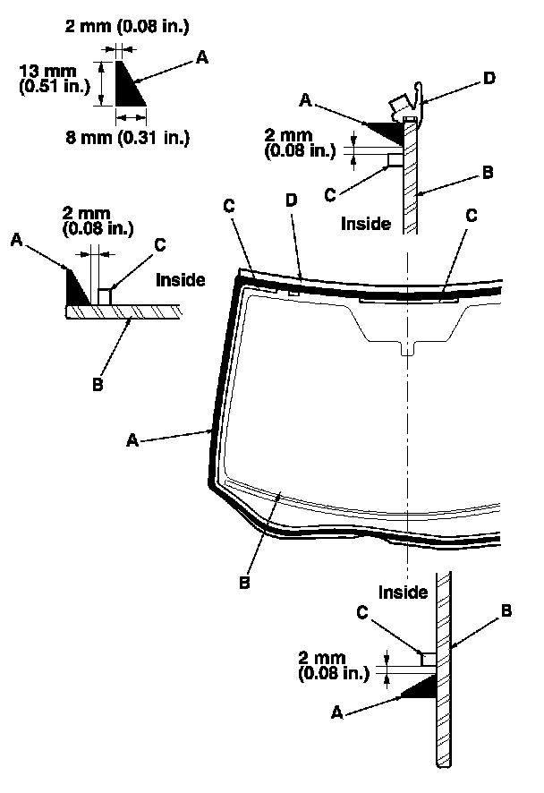 20. Pack adhesive into the cartridge without air pockets to ensure continuous delivery. Put the cartridge in a caulking gun, and run a bead of adhesive (A) around the edge of the windshield (B) between the dams (C) and molding (D) as shown. Apply the adhesive within 30 minutes after applying the glass primer. Make a slightly thicker bead at each corner.