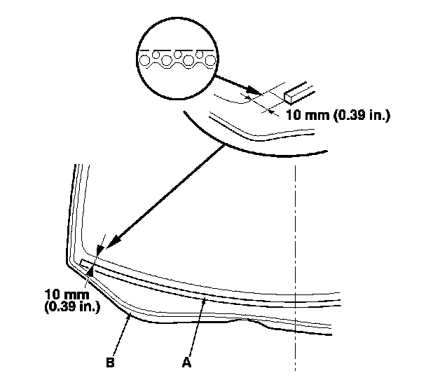 14. Attach the molding upper seal (A) with adhesive tape to the inside surface of the molding (B) as shown.