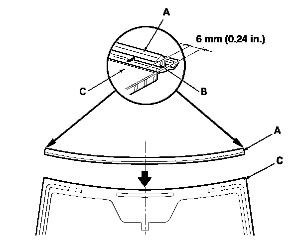 13. Attach the molding (A) with adhesive tape (B) to the upper edge of the windshield (C). Be careful not to touch the windshield where adhesive will be applied.