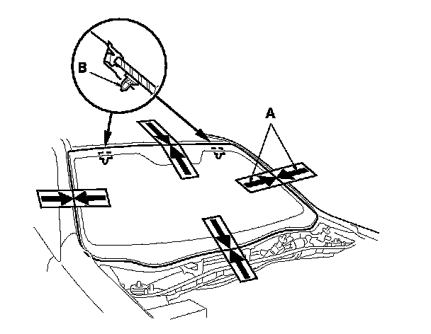 12. Attach the dashboard seal (A) with adhesive tape to the inside surface of the windshield (B) as shown.