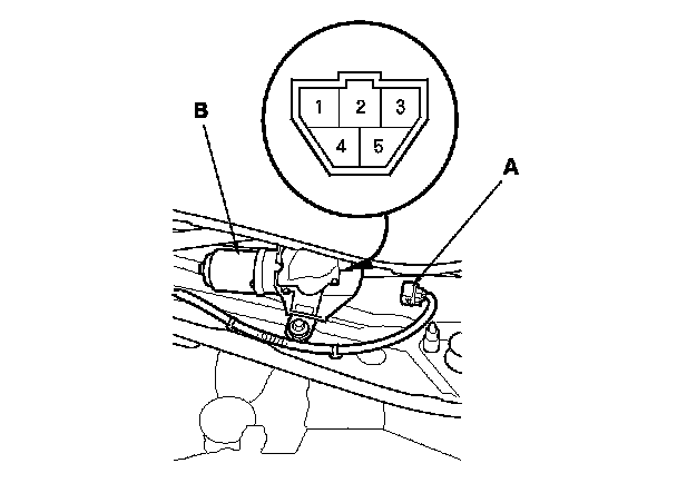 3. Disconnect the 5P connector (A) from the windshield wiper motor (B).