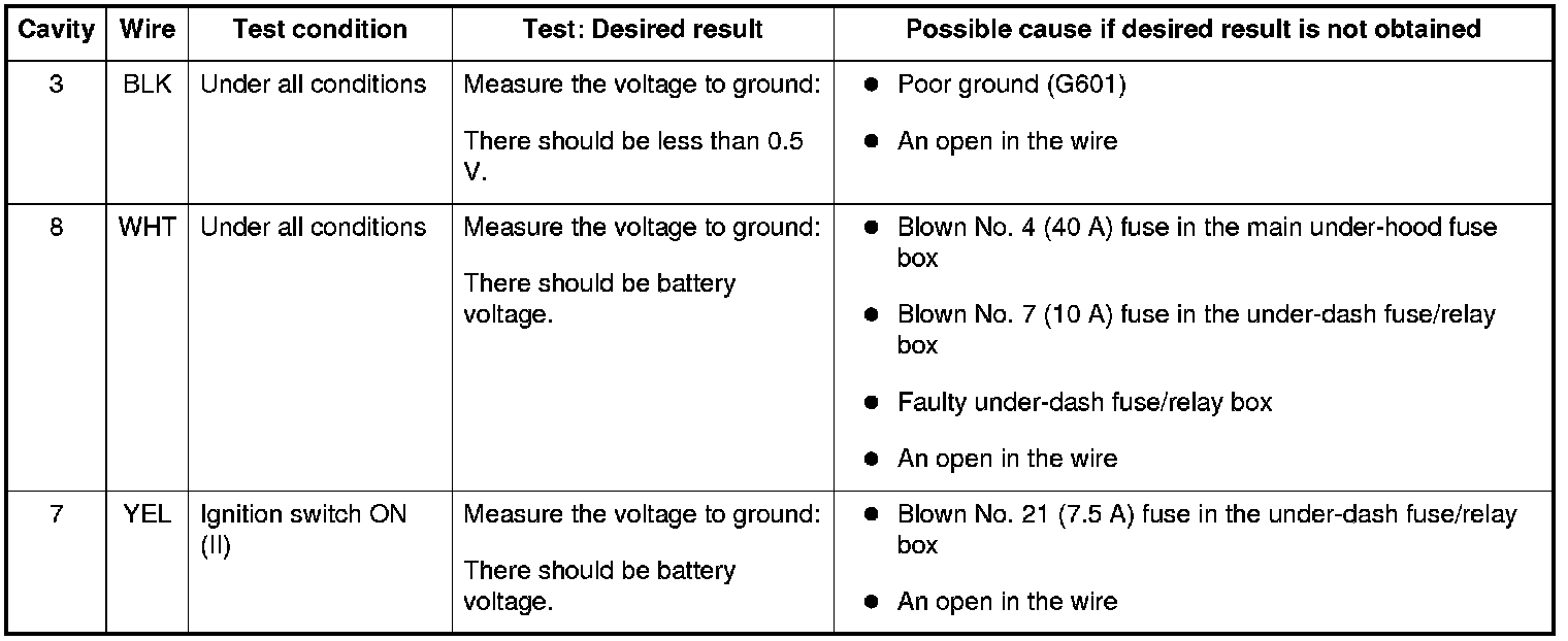 6. Reconnect the 8P connector to the wiper/washer switch, and do these input tests at the following connector.