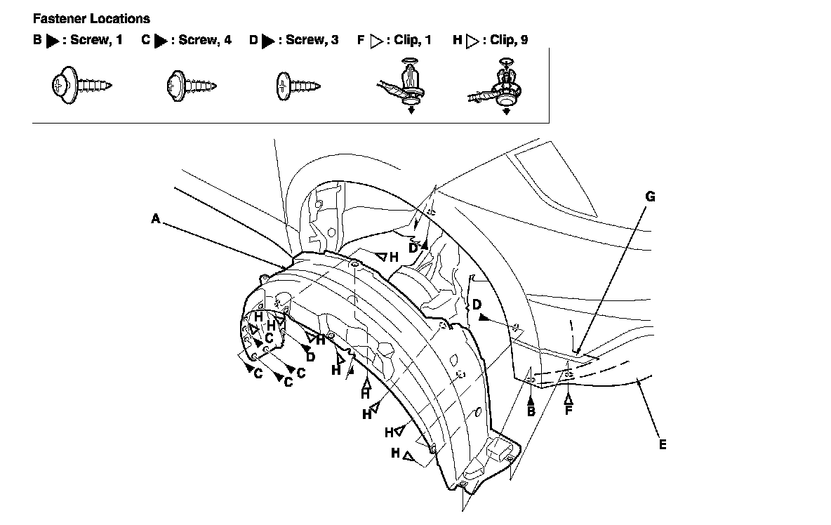 -3 From the wheel arch, remove the clips (H) securing the front inner fender (and splash shield) to the body.