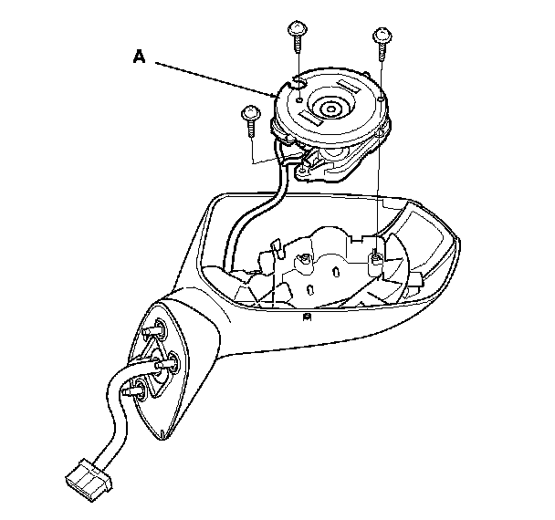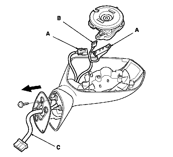 7. Remove the connectors (A) and (B) (right side), then remove the screw and separate the harness (C) from the power mirror.